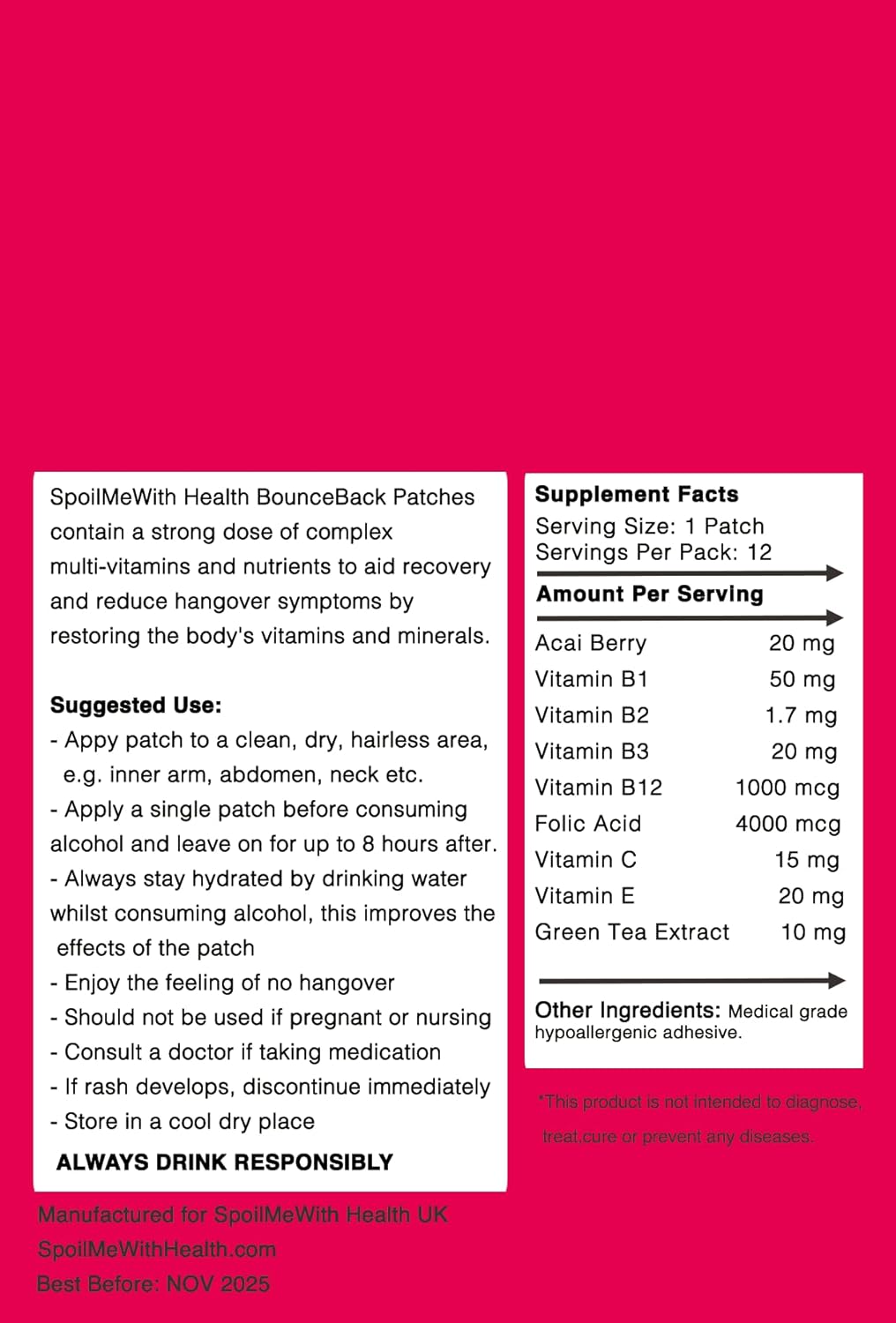 SpoilMeWith Health BounceBack Patches contain a strong dose of complex multi-vitamins and nutrients to aid recovery and reduce hangover symptoms by restoring the body's vitamins and minerals, without having to think about it.
